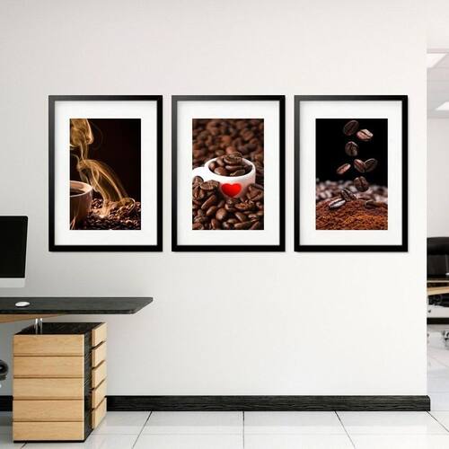Kit 3 quadros grandes café 60x48cm Cor: moldura preta Informações do produto tire todas as suas dúvidas no descritivo abaixo: decoração para quarto, sala, cozinha, escritório, área gourmet e muito mais. Chega de paredes vazias medidas - cada peça tem 60x48cm . Material do papel - papel fotográfico brilhante de altíssima resolução acabamento - todos os quadros são acompanhados de vidro para proteção da imagem. - moldura em madeira maciça na cor preta ou branca conforme produto escolhido e pendurador. - paspatur branco com 7cm de largura - os quadros são embalados de forma segura com plástico bolha com camada dupla de acordo com o tamanho dos quadros. - de 3 meses. Meu quadro chegou. Como posso fixá-lo Você precisa apenas de um martelo e um prego, pois os quadros já vão acompanhados de penduradores. Esta é a forma mais indicada. Como posso limpar meu quadro A limpeza é feita como um móvel comum da sua casa. Apenas um pano seco ou espanador são suficientes para tal Ean: 7908991742325