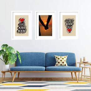 Kit 3 quadros grandes casal declaração 60x48cm Cor: moldura preta Informações do produto tire todas as suas dúvidas no descritivo abaixo: decoração para quarto, sala, cozinha, escritório, área gourmet e muito mais. Chega de paredes vazias medidas - cada peça tem 60x48cm . Material do papel - papel fotográfico brilhante de altíssima resolução acabamento - todos os quadros são acompanhados de vidro para proteção da imagem. - moldura em madeira maciça na cor preta ou branca conforme produto escolhido e pendurador. - paspatur branco com 7cm de largura - os quadros são embalados de forma segura com plástico bolha com camada dupla de acordo com o tamanho dos quadros. - de 3 meses. Meu quadro chegou. Como posso fixá-lo Você precisa apenas de um martelo e um prego, pois os quadros já vão acompanhados de penduradores. Esta é a forma mais indicada. Como posso limpar meu quadro A limpeza é feita como um móvel comum da sua casa. Apenas um pano seco ou espanador são suficientes para tal Ean: 7908991742486
