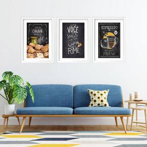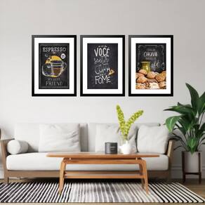 Kit 3 quadros grandes cozinha café 60x48cm Cor: moldura preta Informações do produto tire todas as suas dúvidas no descritivo abaixo: decoração para quarto, sala, cozinha, escritório, área gourmet e muito mais. Chega de paredes vazias medidas - cada peça tem 60x48cm . Material do papel - papel fotográfico brilhante de altíssima resolução acabamento - todos os quadros são acompanhados de vidro para proteção da imagem. - moldura em madeira maciça na cor preta ou branca conforme produto escolhido e pendurador. - paspatur branco com 7cm de largura - os quadros são embalados de forma segura com plástico bolha com camada dupla de acordo com o tamanho dos quadros. - de 3 meses. Meu quadro chegou. Como posso fixá-lo Você precisa apenas de um martelo e um prego, pois os quadros já vão acompanhados de penduradores. Esta é a forma mais indicada. Como posso limpar meu quadro A limpeza é feita como um móvel comum da sua casa. Apenas um pano seco ou espanador são suficientes para tal