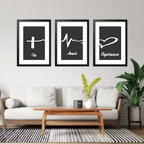 Kit 3 quadros grandes fé amor e esperança 60x48cm Cor: moldura preta Informações do produto tire todas as suas dúvidas no descritivo abaixo: decoração para quarto, sala, cozinha, escritório, área gourmet e muito mais. Chega de paredes vazias medidas - cada peça tem 60x48cm . Material do papel - papel fotográfico brilhante de altíssima resolução acabamento - todos os quadros são acompanhados de vidro para proteção da imagem. - moldura em madeira maciça na cor preta ou branca conforme produto escolhido e pendurador. - paspatur branco com 7cm de largura - os quadros são embalados de forma segura com plástico bolha com camada dupla de acordo com o tamanho dos quadros. - de 3 meses. Meu quadro chegou. Como posso fixá-lo Você precisa apenas de um martelo e um prego, pois os quadros já vão acompanhados de penduradores. Esta é a forma mais indicada. Como posso limpar meu quadro A limpeza é feita como um móvel comum da sua casa. Apenas um pano seco ou espanador são suficientes para tal Ean: 7908991742707