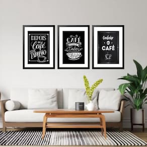 Kit 3 quadros grandes frases café 60x48cm Cor: moldura branca Informações do produto tire todas as suas dúvidas no descritivo abaixo: decoração para quarto, sala, cozinha, escritório, área gourmet e muito mais. Chega de paredes vazias medidas - cada peça tem 60x48cm . Material do papel - papel fotográfico brilhante de altíssima resolução acabamento - todos os quadros são acompanhados de vidro para proteção da imagem. - moldura em madeira maciça na cor preta ou branca conforme produto escolhido e pendurador. - paspatur branco com 7cm de largura - os quadros são embalados de forma segura com plástico bolha com camada dupla de acordo com o tamanho dos quadros. - de 3 meses. Meu quadro chegou. Como posso fixá-lo Você precisa apenas de um martelo e um prego, pois os quadros já vão acompanhados de penduradores. Esta é a forma mais indicada. Como posso limpar meu quadro A limpeza é feita como um móvel comum da sua casa. Apenas um pano seco ou espanador são suficientes para tal
