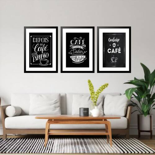 Kit 3 quadros grandes frases café 60x48cm Cor: moldura preta Informações do produto tire todas as suas dúvidas no descritivo abaixo: decoração para quarto, sala, cozinha, escritório, área gourmet e muito mais. Chega de paredes vazias medidas - cada peça tem 60x48cm . Material do papel - papel fotográfico brilhante de altíssima resolução acabamento - todos os quadros são acompanhados de vidro para proteção da imagem. - moldura em madeira maciça na cor preta ou branca conforme produto escolhido e pendurador. - paspatur branco com 7cm de largura - os quadros são embalados de forma segura com plástico bolha com camada dupla de acordo com o tamanho dos quadros. - de 3 meses. Meu quadro chegou. Como posso fixá-lo Você precisa apenas de um martelo e um prego, pois os quadros já vão acompanhados de penduradores. Esta é a forma mais indicada. Como posso limpar meu quadro A limpeza é feita como um móvel comum da sua casa. Apenas um pano seco ou espanador são suficientes para tal