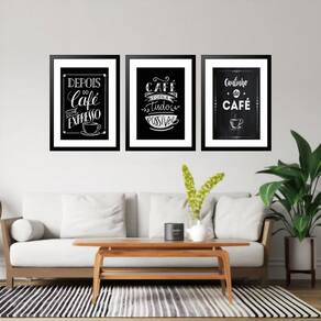 Kit 3 quadros grandes frases café 60x48cm Cor: moldura preta Informações do produto tire todas as suas dúvidas no descritivo abaixo: decoração para quarto, sala, cozinha, escritório, área gourmet e muito mais. Chega de paredes vazias medidas - cada peça tem 60x48cm . Material do papel - papel fotográfico brilhante de altíssima resolução acabamento - todos os quadros são acompanhados de vidro para proteção da imagem. - moldura em madeira maciça na cor preta ou branca conforme produto escolhido e pendurador. - paspatur branco com 7cm de largura - os quadros são embalados de forma segura com plástico bolha com camada dupla de acordo com o tamanho dos quadros. - de 3 meses. Meu quadro chegou. Como posso fixá-lo Você precisa apenas de um martelo e um prego, pois os quadros já vão acompanhados de penduradores. Esta é a forma mais indicada. Como posso limpar meu quadro A limpeza é feita como um móvel comum da sua casa. Apenas um pano seco ou espanador são suficientes para tal Marca: Não Informado