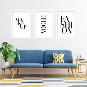 Kit 3 quadros grandes frases moda 60x48cm Cor: moldura preta Informações do produto tire todas as suas dúvidas no descritivo abaixo: decoração para quarto, sala, cozinha, escritório, área gourmet e muito mais. Chega de paredes vazias medidas - cada peça tem 60x48cm . Material do papel - papel fotográfico brilhante de altíssima resolução acabamento - todos os quadros são acompanhados de vidro para proteção da imagem. - moldura em madeira maciça na cor preta ou branca conforme produto escolhido e pendurador. - paspatur branco com 7cm de largura - os quadros são embalados de forma segura com plástico bolha com camada dupla de acordo com o tamanho dos quadros. - de 3 meses. Meu quadro chegou. Como posso fixá-lo Você precisa apenas de um martelo e um prego, pois os quadros já vão acompanhados de penduradores. Esta é a forma mais indicada. Como posso limpar meu quadro A limpeza é feita como um móvel comum da sua casa. Apenas um pano seco ou espanador são suficientes para tal