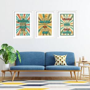 Kit 3 quadros grandes frases vintage 60x48cm Cor: moldura preta Informações do produto tire todas as suas dúvidas no descritivo abaixo: decoração para quarto, sala, cozinha, escritório, área gourmet e muito mais. Chega de paredes vazias medidas - cada peça tem 60x48cm . Material do papel - papel fotográfico brilhante de altíssima resolução acabamento - todos os quadros são acompanhados de vidro para proteção da imagem. - moldura em madeira maciça na cor preta ou branca conforme produto escolhido e pendurador. - paspatur branco com 7cm de largura - os quadros são embalados de forma segura com plástico bolha com camada dupla de acordo com o tamanho dos quadros. - de 3 meses. Meu quadro chegou. Como posso fixá-lo Você precisa apenas de um martelo e um prego, pois os quadros já vão acompanhados de penduradores. Esta é a forma mais indicada. Como posso limpar meu quadro A limpeza é feita como um móvel comum da sua casa. Apenas um pano seco ou espanador são suficientes para tal Marca: Não Informado Ean: 7908991749409