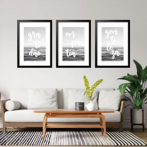 Kit 3 quadros grandes gentileza empatia gratidão 60x48cm Cor: moldura branca Informações do produto tire todas as suas dúvidas no descritivo abaixo: decoração para quarto, sala, cozinha, escritório, área gourmet e muito mais. Chega de paredes vazias medidas - cada peça tem 60x48cm . Material do papel - papel fotográfico brilhante de altíssima resolução acabamento - todos os quadros são acompanhados de vidro para proteção da imagem. - moldura em madeira maciça na cor preta ou branca conforme produto escolhido e pendurador. - paspatur branco com 7cm de largura - os quadros são embalados de forma segura com plástico bolha com camada dupla de acordo com o tamanho dos quadros. - de 3 meses. Meu quadro chegou. Como posso fixá-lo Você precisa apenas de um martelo e um prego, pois os quadros já vão acompanhados de penduradores. Esta é a forma mais indicada. Como posso limpar meu quadro A limpeza é feita como um móvel comum da sua casa. Apenas um pano seco ou espanador são suficientes para tal Marca: Não Informado