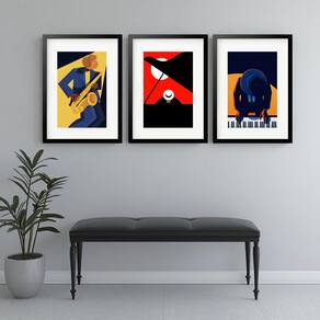 Kit 3 Quadros Grandes Jazz Vetor - 60x48cm - Cor: Moldura Preta