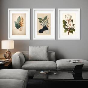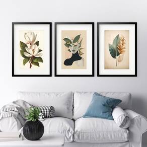 Kit 3 Quadros Grandes Mulher e Plantas - 60x48cm - Cor: Moldura Preta