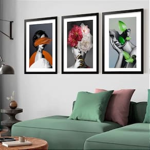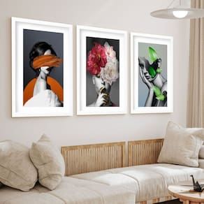 Kit 3 Quadros Grandes Mulheres Surrealismo Plantas 60x48cm - Cor: Moldura Branca