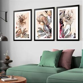Kit 3 Quadros Grandes Old Flowres 60x48cm - Cor: Moldura Branca
