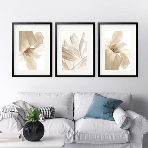 Kit 3 Quadros Grandes Pétalas Flores Beges - 60x48cm - Cor: Moldura Branca