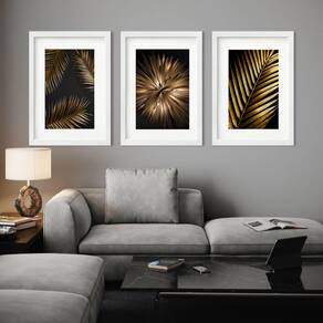Kit 3 Quadros Grandes Plantas Douradas - 60x48cm - Cor: Moldura Branca