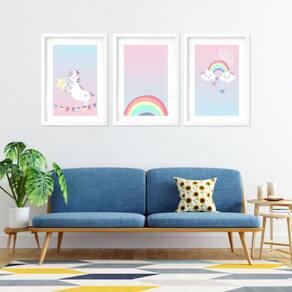 Kit 3 quadros grandes quarto infantil unicórnio 60x48cm Cor: moldura preta Informações do produto tire todas as suas dúvidas no descritivo abaixo: decoração para quarto, sala, cozinha, escritório, área gourmet e muito mais. Chega de paredes vazias medidas - cada peça tem 60x48cm . Material do papel - papel fotográfico brilhante de altíssima resolução acabamento - todos os quadros são acompanhados de vidro para proteção da imagem. - moldura em madeira maciça na cor preta ou branca conforme produto escolhido e pendurador. - paspatur branco com 7cm de largura - os quadros são embalados de forma segura com plástico bolha com camada dupla de acordo com o tamanho dos quadros. - de 3 meses. Meu quadro chegou. Como posso fixá-lo Você precisa apenas de um martelo e um prego, pois os quadros já vão acompanhados de penduradores. Esta é a forma mais indicada. Como posso limpar meu quadro A limpeza é feita como um móvel comum da sua casa. Apenas um pano seco ou espanador são suficientes para tal