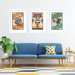 Kit 3 quadros grandes retro cinema 60x48cm Cor: moldura branca Informações do produto tire todas as suas dúvidas no descritivo abaixo: decoração para quarto, sala, cozinha, escritório, área gourmet e muito mais. Chega de paredes vazias medidas - cada peça tem 60x48cm . Material do papel - papel fotográfico brilhante de altíssima resolução acabamento - todos os quadros são acompanhados de vidro para proteção da imagem. - moldura em madeira maciça na cor preta ou branca conforme produto escolhido e pendurador. - paspatur branco com 7cm de largura - os quadros são embalados de forma segura com plástico bolha com camada dupla de acordo com o tamanho dos quadros. - de 3 meses. Meu quadro chegou. Como posso fixá-lo Você precisa apenas de um martelo e um prego, pois os quadros já vão acompanhados de penduradores. Esta é a forma mais indicada. Como posso limpar meu quadro A limpeza é feita como um móvel comum da sua casa. Apenas um pano seco ou espanador são suficientes para tal Marca: Não Informado