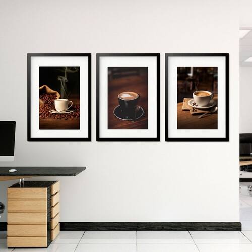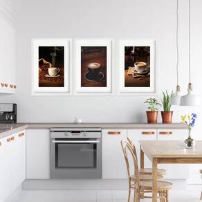 Kit 3 Quadros Grandes Xícaras de Café 60x48cm - Cor: Moldura Branca