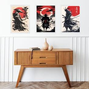 Kit 3 quadros gravuras artes samurais 24x18cm - com vidro Cor: moldura preta Informações do produto tire todas as suas dúvidas no descritivo abaixo: decoração para quarto, sala, cozinha, escritório, área gourmet e muito mais. Chega de paredes vazias medidas - cada peça tem 24x18cm a5 . Material do papel - papel fotográfico brilhante de altíssima resolução acabamento - todos os quadros são acompanhados de vidro para proteção da imagem. - moldura em madeira maciça na cor preta ou branca conforme produto escolhido e pendurador . - os quadros são embalados de forma segura com plástico bolha com camada dupla de acordo com o tamanho dos quadros. Garantia - garantia de 3 meses. Meu quadro chegou. Como posso fixá-lo Você precisa apenas de um martelo e um prego, pois os quadros já vão acompanhados de penduradores. Esta é a forma mais indicada. Como posso limpar meu quadro A limpeza é feita como um móvel comum da sua casa. Apenas um pano seco ou espanador são suficientes para tal