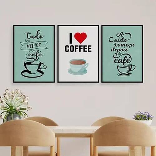 Kit 3 quadros i love coffee 33x24cm - com vidro Moldura: madeira preta Informações do produto Decoração para quarto, sala, cozinha, escritório, área gourmet e muito mais. Chega de paredes vazias Medidas - cada peça tem 33x24cm a4 . Material do papel - papel fotográfico brilhante de altíssima resolução Acabamento - todos os quadros são acompanhados de vidro para proteção da imagem. - moldura em madeira maciça na cor preta e pendurador . - os quadros são embalados de forma segura com plástico bolha com camada dupla de acordo com o tamanho dos quadros. - de 3 meses. Meu quadro chegou. Como posso fixá-lo Você precisa apenas de um martelo e um prego, pois os quadros já vão acompanhados de penduradores. Esta é a forma mais indicada. Como posso limpar meu quadro A limpeza é feita como um móvel comum da sua casa. Apenas um pano seco ou espanador são suficientes para tal Ean: 7895145488355