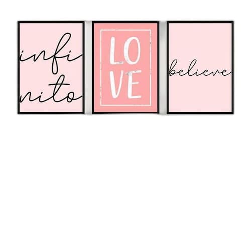 Kit 3 quadros infinito, love, believe rosa 45x34cm - com vidro Moldura: madeira preta Informações do produto tire todas as suas dúvidas no descritivo abaixo: decoração para quarto, sala, cozinha, escritório, área gourmet e muito mais. Chega de paredes vazias medidas - cada peça tem 45x34cm a3 . Material do papel - papel fotográfico brilhante de altíssima resolução acabamento - todos os quadros são acompanhados de vidro para proteção da imagem. - moldura em madeira maciça na cor preta e pendurador . - os quadros são embalados de forma segura com plástico bolha com camada dupla de acordo com o tamanho dos quadros. - de 3 meses. Meu quadro chegou. Como posso fixá-lo Você precisa apenas de um martelo e um prego, pois os quadros já vão acompanhados de penduradores. Esta é a forma mais indicada. Como posso limpar meu quadro A limpeza é feita como um móvel comum da sua casa. Apenas um pano seco ou espanador são suficientes para tal Marca: Não Informado Ean: 7895142174961