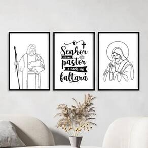 Kit 3 quadros jesus minimalista - meu pastor 45x34cm Cor: moldura preta Informações do produto tire todas as suas dúvidas no descritivo abaixo: decoração para quarto, sala, cozinha, escritório, área gourmet e muito mais. Chega de paredes vazias. Medidas - cada peça tem 45x34cm a3 . Material do papel - papel fotográfico brilhante de altíssima resolução acabamento - todos os quadros são acompanhados de uma película de acetato para proteção da imagem. - os quadros são embalados de forma segura com plástico bolha com camada dupla de acordo com o tamanho dos quadros. Garantia - garantia de 3 meses. Meu quadro chegou. Como posso fixá-lo Você precisa apenas de um martelo e um prego, pois os quadros já vão acompanhados de penduradores. Esta é a forma mais indicada. Caso prefira, você pode utilizar uma fita dupla face neste caso, sugerimos de alta qualidade para evitar que descole e seu quadro caia . Como posso limpar meu quadro A limpeza é feita como um móvel comum da sua casa. Apenas um pano seco ou espanador são suficientes para tal