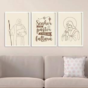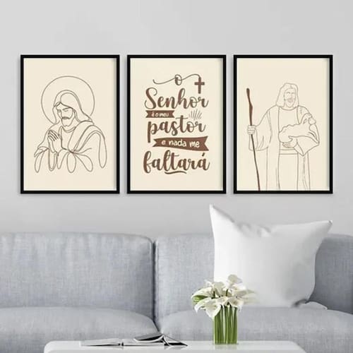 Kit 3 quadros jesus - o senhor é meu pastor 33x24cm Cor: moldura preta Informações do produto tire todas as suas dúvidas no descritivo abaixo: decoração para quarto, sala, cozinha, escritório, área gourmet e muito mais. Chega de paredes vazias medidas - cada peça tem 33x24cm a4 . Material do papel - papel fotográfico brilhante de altíssima resolução acabamento - todos os quadros são acompanhados de uma película de acetato para proteção da imagem. - os quadros são embalados de forma segura com plástico bolha com camada dupla de acordo com o tamanho dos quadros. Garantia - garantia de 3 meses. Meu quadro chegou. Como posso fixá-lo Você precisa apenas de um martelo e um prego, pois os quadros já vão acompanhados de penduradores. Esta é a forma mais indicada. Caso prefira, você pode utilizar uma fita dupla face neste caso, sugerimos de alta qualidade para evitar que descole e seu quadro caia . Como posso limpar meu quadro A limpeza é feita como um móvel comum da sua casa. Apenas um pano seco ou espanador são suficientes para tal
