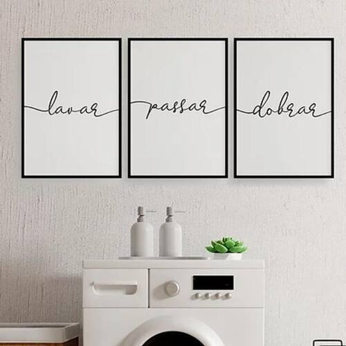 Kit 3 quadros lavanderia lavar passar dobrar 45x34cm - com vidro Moldura: madeira preta Informações do produto Decoração para quarto, sala, cozinha, escritório, área gourmet e muito mais. Chega de paredes vazias Medidas - cada peça tem 45x34cm a3 . Material do papel - papel fotográfico brilhante de altíssima resolução Acabamento - todos os quadros são acompanhados de vidro para proteção da imagem. - moldura em madeira maciça na cor preta e pendurador . - os quadros são embalados de forma segura com plástico bolha com camada dupla de acordo com o tamanho dos quadros. - de 3 meses. Meu quadro chegou. Como posso fixá-lo Você precisa apenas de um martelo e um prego, pois os quadros já vão acompanhados de penduradores. Esta é a forma mais indicada. Como posso limpar meu quadro A limpeza é feita como um móvel comum da sua casa. Apenas um pano seco ou espanador são suficientes para tal Marca: Não Informado