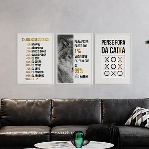 Kit 3 quadros lobo empreendedorismo 45x34cm Moldura: madeira branca Informações do produto decoração para quarto, sala, cozinha, escritório, área gourmet e muito mais. Chega de paredes vazias Medidas - cada peça tem 45x34cm a3 . Material do papel - papel fotográfico brilhante de altíssima resolução Acabamento - todos os quadros são acompanhados de uma película de acetato para proteção da imagem. - os quadros são embalados de forma segura com plástico bolha com camada dupla de acordo com o tamanho dos quadros. - de 3 meses. Meu quadro chegou. Como posso fixá-lo Você precisa apenas de um martelo e um prego, pois os quadros já vão acompanhados de penduradores. Esta é a forma mais indicada. Caso prefira, você pode utilizar uma fita dupla face neste caso, sugerimos de alta qualidade para evitar que descole e seu quadro caia . Como posso limpar meu quadro A limpeza é feita como um móvel comum da sua casa. Apenas um pano seco ou espanador são suficientes para tal Marca: Não Informado
