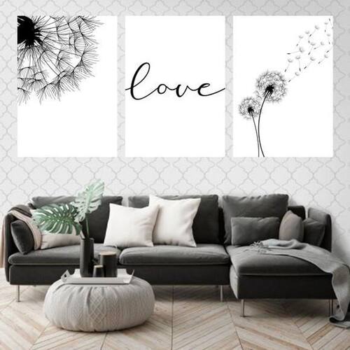 Kit 3 Quadros Love Dente De Leão 24X18Cm Madeira Branca