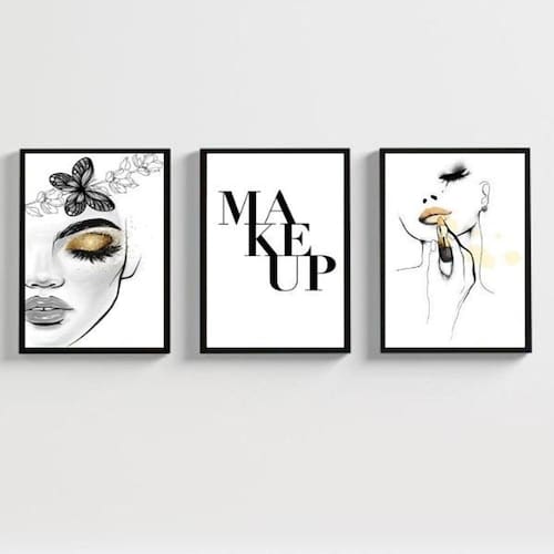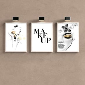 Características do produto: - Kit com 3 quadros decorativos de maquiagem - Medidas de cada peça: 24x18cm A5 - Moldura em madeira branca - Acompanha vidro para proteção da imagem - Moldura em madeira maciça na cor preta - Pendurador incluso - Embalagem segura com plástico bolha - Garantia de 3 meses