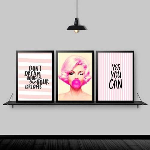 Kit 3 quadros marilyn life your dreams 24x18cm Moldura: madeira preta Informações do produto tire todas as suas dúvidas no descritivo abaixo: decoração para quarto, sala, cozinha, escritório, área gourmet e muito mais. Chega de paredes vazias medidas - cada peça tem 24x18cm a5 . Material do papel - papel fotográfico brilhante de altíssima resolução acabamento - todos os quadros são acompanhados de uma película de acetato para proteção da imagem. - os quadros são embalados de forma segura com plástico bolha com camada dupla de acordo com o tamanho dos quadros. - de 3 meses. Meu quadro chegou. Como posso fixá-lo Você precisa apenas de um martelo e um prego, pois os quadros já vão acompanhados de penduradores. Esta é a forma mais indicada. Caso prefira, você pode utilizar uma fita dupla face neste caso, sugerimos de alta qualidade para evitar que descole e seu quadro caia . Como posso limpar meu quadro A limpeza é feita como um móvel comum da sua casa. Apenas um pano seco ou espanador são suficientes para tal Marca: Não Informado