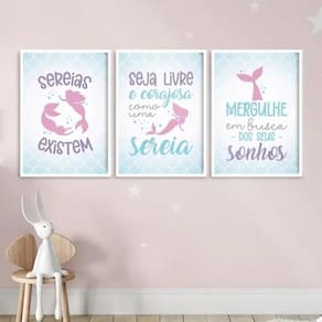 Kit 3 quadros menina - sereias existem 33x24cm - com vidro
