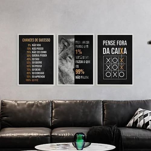 Kit 3 quadros motivacionais empreendedorismo 24x18cm Moldura: madeira preta Informações do produto tire todas as suas dúvidas no descritivo abaixo: decoração para quarto, sala, cozinha, escritório, área gourmet e muito mais. Chega de paredes vazias medidas - cada peça tem 24x18cm a5 . Material do papel - papel fotográfico brilhante de altíssima resolução acabamento - todos os quadros são acompanhados de uma película de acetato para proteção da imagem. - moldura em madeira maciça na cor preta e pendurador móvel que pode ser retirado facilmente caso deseje fixar com fita dupla face. - os quadros são embalados de forma segura com plástico bolha com camada dupla de acordo com o tamanho dos quadros. Garantia - garantia de 3 meses. Meu quadro chegou. Como posso fixá-lo Você precisa apenas de um martelo e um prego, pois os quadros já vão acompanhados de penduradores. Esta é a forma mais indicada. Caso prefira, você pode utilizar uma fita dupla face neste caso, sugerimos de alta qualidade para evitar que descole e seu quadro caia . Como posso limpar meu quadro A limpeza é feita como um móvel comum da sua casa. Apenas um pano seco ou espanador são suficientes para tal