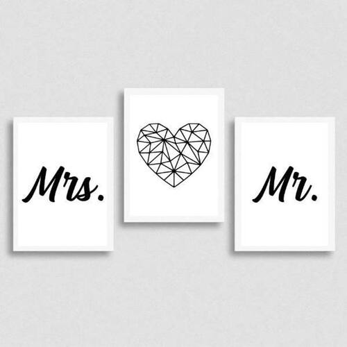 Kit 3 quadros mr and mrs coração geométrico 24x18cm
