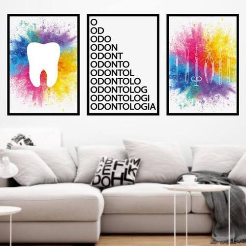 Kit 3 quadros odontologia, dente - colorido 45x34cm - com vidro Moldura: madeira preta Informações do produto tire todas as suas dúvidas no descritivo abaixo: decoração para quarto, sala, cozinha, escritório, área gourmet e muito mais. Chega de paredes vazias medidas - cada peça tem 45x34cm a3 . Material do papel - papel fotográfico brilhante de altíssima resolução acabamento - todos os quadros são acompanhados de vidro para proteção da imagem. - moldura em madeira maciça na cor preta e pendurador . - os quadros são embalados de forma segura com plástico bolha com camada dupla de acordo com o tamanho dos quadros. - de 3 meses. Meu quadro chegou. Como posso fixá-lo Você precisa apenas de um martelo e um prego, pois os quadros já vão acompanhados de penduradores. Esta é a forma mais indicada. Como posso limpar meu quadro A limpeza é feita como um móvel comum da sua casa. Apenas um pano seco ou espanador são suficientes para tal Marca: Não Informado