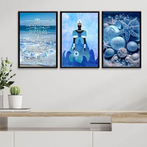 Kit 3 quadros orixá iemanjá- odayá 24x18cm - com vidro Moldura: madeira branca Informações do produto tire todas as suas dúvidas no descritivo abaixo: decoração para quarto, sala, cozinha, escritório, área gourmet e muito mais. Chega de paredes vazias medidas - cada peça tem 24x18cm a5 . Material do papel - papel fotográfico brilhante de altíssima resolução acabamento - todos os quadros são acompanhados de vidro para proteção da imagem. - moldura em madeira maciça na cor preta ou branca conforme produto escolhido e pendurador . - os quadros são embalados de forma segura com plástico bolha com camada dupla de acordo com o tamanho dos quadros. Garantia - garantia de 3 meses. Meu quadro chegou. Como posso fixá-lo Você precisa apenas de um martelo e um prego, pois os quadros já vão acompanhados de penduradores. Esta é a forma mais indicada. Como posso limpar meu quadro A limpeza é feita como um móvel comum da sua casa. Apenas um pano seco ou espanador são suficientes para tal Ean: 7896833611505