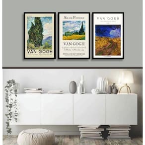 Kit 3 quadros paisagens de van gogh 24x18cm Moldura: madeira preta Informações do produto tire todas as suas dúvidas no descritivo abaixo: decoração para quarto, sala, cozinha, escritório, área gourmet e muito mais. Chega de paredes vazias medidas - cada peça tem 24x18cm a5 . Material do papel - papel fotográfico brilhante de altíssima resolução acabamento - todos os quadros são acompanhados de uma película de acetato para proteção da imagem. - os quadros são embalados de forma segura com plástico bolha com camada dupla de acordo com o tamanho dos quadros. Garantia - garantia de 3 meses. Meu quadro chegou. Como posso fixá-lo Você precisa apenas de um martelo e um prego, pois os quadros já vão acompanhados de penduradores. Esta é a forma mais indicada. Caso prefira, você pode utilizar uma fita dupla face neste caso, sugerimos de alta qualidade para evitar que descole e seu quadro caia . Como posso limpar meu quadro A limpeza é feita como um móvel comum da sua casa. Apenas um pano seco ou espanador são suficientes para tal