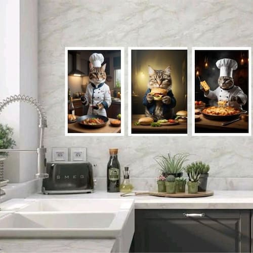 Kit 3 quadros para cozinha gatos com comidas 24x18cm Cor: moldura preta Informações do produto tire todas as suas dúvidas no descritivo abaixo: decoração para quarto, sala, cozinha, escritório, área gourmet e muito mais. Chega de paredes vazias medidas - cada peça tem 24x18cm a5 . Material do papel - papel fotográfico brilhante de altíssima resolução acabamento - todos os quadros são acompanhados de uma película de acetato para proteção da imagem. - os quadros são embalados de forma segura com plástico bolha com camada dupla de acordo com o tamanho dos quadros. Garantia - garantia de 3 meses. Meu quadro chegou. Como posso fixá-lo Você precisa apenas de um martelo e um prego, pois os quadros já vão acompanhados de penduradores. Esta é a forma mais indicada. Caso prefira, você pode utilizar uma fita dupla face neste caso, sugerimos de alta qualidade para evitar que descole e seu quadro caia . Como posso limpar meu quadro A limpeza é feita como um móvel comum da sua casa. Apenas um pano seco ou espanador são suficientes para tal