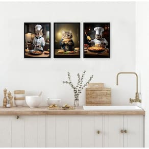 Kit 3 quadros para cozinha gatos com comidas 24x18cm Cor: moldura branca Informações do produto tire todas as suas dúvidas no descritivo abaixo: decoração para quarto, sala, cozinha, escritório, área gourmet e muito mais. Chega de paredes vazias medidas - cada peça tem 24x18cm a5 . Material do papel - papel fotográfico brilhante de altíssima resolução acabamento - todos os quadros são acompanhados de uma película de acetato para proteção da imagem. - os quadros são embalados de forma segura com plástico bolha com camada dupla de acordo com o tamanho dos quadros. Garantia - garantia de 3 meses. Meu quadro chegou. Como posso fixá-lo Você precisa apenas de um martelo e um prego, pois os quadros já vão acompanhados de penduradores. Esta é a forma mais indicada. Caso prefira, você pode utilizar uma fita dupla face neste caso, sugerimos de alta qualidade para evitar que descole e seu quadro caia . Como posso limpar meu quadro A limpeza é feita como um móvel comum da sua casa. Apenas um pano seco ou espanador são suficientes para tal