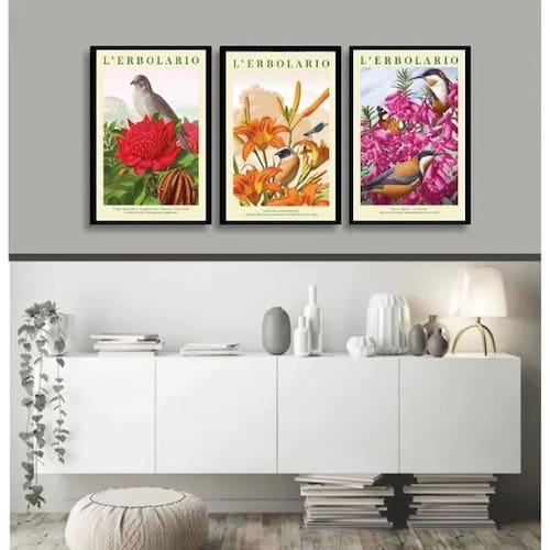 Kit 3 Quadros Passarinhos Flores Colorido 45X34Cm - Vidro