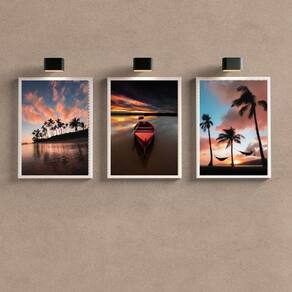 Kit 3 Quadros Sala Por Do Sol Na Praia 33X24Cm - Com Vidro