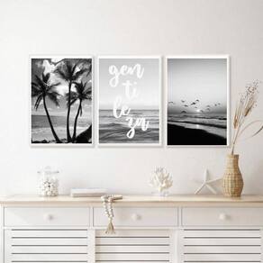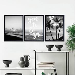 Kit 3 quadros praia preto e branco gentileza 24x18cm - com vidro Moldura: madeira preta Informações do produto tire todas as suas dúvidas no descritivo abaixo: decoração para quarto, sala, cozinha, escritório, área gourmet e muito mais. Chega de paredes vazias medidas - cada peça tem 24x18cm a5 . Material do papel - papel fotográfico brilhante de altíssima resolução acabamento - todos os quadros são acompanhados de vidro para proteção da imagem. - moldura em madeira maciça na cor preta e pendurador . - os quadros são embalados de forma segura com plástico bolha com camada dupla de acordo com o tamanho dos quadros. Garantia - garantia de 3 meses. Meu quadro chegou. Como posso fixá-lo Você precisa apenas de um martelo e um prego, pois os quadros já vão acompanhados de penduradores. Esta é a forma mais indicada. Como posso limpar meu quadro A limpeza é feita como um móvel comum da sua casa. Apenas um pano seco ou espanador são suficientes para tal Ean: 7899326108278
