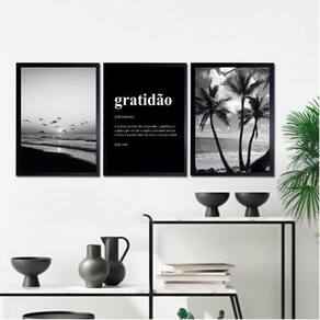 Kit 3 quadros praia preto e branco gratidão significado 33x24cm - com vidro Moldura: madeira branca Informações do produto tire todas as suas dúvidas no descritivo abaixo: decoração para quarto, sala, cozinha, escritório, área gourmet e muito mais. Chega de paredes vazias medidas - cada peça tem 33x24cm a4 . Material do papel - papel fotográfico brilhante de altíssima resolução acabamento - todos os quadros são acompanhados de vidro para proteção da imagem. - moldura em madeira maciça na cor preta e pendurador . - os quadros são embalados de forma segura com plástico bolha com camada dupla de acordo com o tamanho dos quadros. Garantia - garantia de 3 meses. Meu quadro chegou. Como posso fixá-lo Você precisa apenas de um martelo e um prego, pois os quadros já vão acompanhados de penduradores. Esta é a forma mais indicada. Como posso limpar meu quadro A limpeza é feita como um móvel comum da sua casa. Apenas um pano seco ou espanador são suficientes para tal Ean: 7897274038104