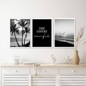 Kit 3 Quadros Praia Preto E Branco Ore Espere Confie 24X18Cm