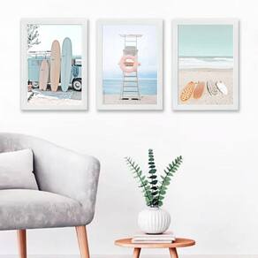 O Kit 3 Quadros Decorativos Fotografias Praia Relax é perfeito para dar um toque especial à decoração do seu quarto, sala, cozinha, escritório, área gourmet e muito mais. Chega de paredes vazias! Cada peça possui medidas de 45x34cm A3 , sendo acompanhada de uma moldura de madeira preta que proporciona um acabamento elegante.