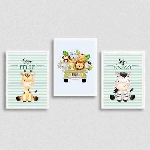 O Kit 3 Quadros Tema Safari Infantil Seja Feliz é ideal para alegrar o quarto do seu filho a e estimular a sua imaginação. Além disso, a temática safari traz um toque de aventura e diversão ao ambiente.