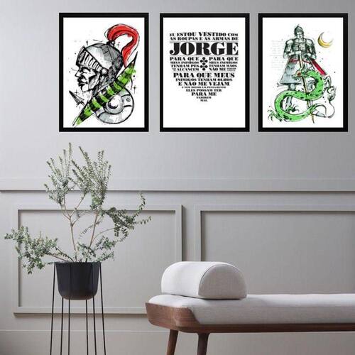 Kit 3 quadros são jorge espada oração 24x18cm Moldura: madeira preta Informações do produto tire todas as suas dúvidas no descritivo abaixo: decoração para quarto, sala, cozinha, escritório, área gourmet e muito mais. Chega de paredes vazias medidas - cada peça tem 24x18cm a5 . Material do papel - papel fotográfico brilhante de altíssima resolução acabamento - todos os quadros são acompanhados de uma película de acetato para proteção da imagem. - moldura em madeira maciça na cor preta ou branca conforme produto escolhido e pendurador móvel que pode ser retirado facilmente caso deseje fixar com fita dupla face. - os quadros são embalados de forma segura com plástico bolha com camada dupla de acordo com o tamanho dos quadros. Garantia - garantia de 3 meses. Meu quadro chegou. Como posso fixá-lo Você precisa apenas de um martelo e um prego, pois os quadros já vão acompanhados de penduradores. Esta é a forma mais indicada. Caso prefira, você pode utilizar uma fita dupla face neste caso, sugerimos de alta qualidade para evitar que descole e seu quadro caia . Como posso limpar meu quadro A limpeza é feita como um móvel comum da sua casa. Apenas um pano seco ou espanador são suficientes para tal