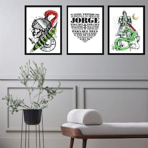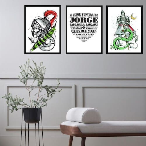 Kit 3 quadros são jorge espada oração 24x18cm Moldura: madeira branca Informações do produto tire todas as suas dúvidas no descritivo abaixo: decoração para quarto, sala, cozinha, escritório, área gourmet e muito mais. Chega de paredes vazias medidas - cada peça tem 24x18cm a5 . Material do papel - papel fotográfico brilhante de altíssima resolução acabamento - todos os quadros são acompanhados de uma película de acetato para proteção da imagem. - os quadros são embalados de forma segura com plástico bolha com camada dupla de acordo com o tamanho dos quadros. Garantia - garantia de 3 meses. Meu quadro chegou. Como posso fixá-lo Você precisa apenas de um martelo e um prego, pois os quadros já vão acompanhados de penduradores. Esta é a forma mais indicada. Caso prefira, você pode utilizar uma fita dupla face neste caso, sugerimos de alta qualidade para evitar que descole e seu quadro caia . Como posso limpar meu quadro A limpeza é feita como um móvel comum da sua casa. Apenas um pano seco ou espanador são suficientes para tal