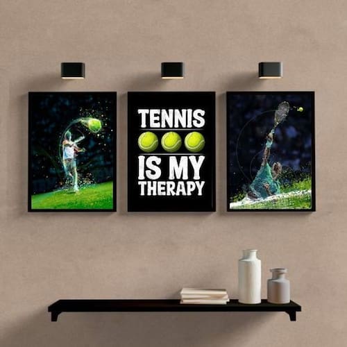 Kit 3 quadros tênnis is my therapy 45x34cm - com vidro Moldura: madeira preta Informações do produto Decoração para quarto, sala, cozinha, escritório, área gourmet e muito mais. Chega de paredes vazias Medidas - cada peça tem 45x34cm a3 . Material do papel - papel fotográfico brilhante de altíssima resolução Acabamento - todos os quadros são acompanhados de vidro para proteção da imagem. - moldura em madeira maciça e pendurador . - os quadros são embalados de forma segura com plástico bolha com camada dupla de acordo com o tamanho dos quadros. - de 3 meses. Meu quadro chegou. Como posso fixá-lo Você precisa apenas de um martelo e um prego, pois os quadros já vão acompanhados de penduradores. Esta é a forma mais indicada. Como posso limpar meu quadro A limpeza é feita como um móvel comum da sua casa. Apenas um pano seco ou espanador são suficientes para tal. Ean: 7894967644123