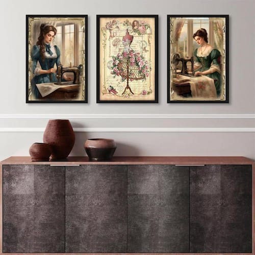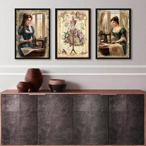 Kit 3 quadros vintage para atelier de costura 33x24cm Moldura: madeira preta Informações do produto tire todas as suas dúvidas no descritivo abaixo: decoração para quarto, sala, cozinha, escritório, área gourmet e muito mais. Chega de paredes vazias medidas - cada peça tem 33x24cm a4 . Material do papel - papel fotográfico brilhante de altíssima resolução acabamento - todos os quadros são acompanhados de uma película de acetato para proteção da imagem. - os quadros são embalados de forma segura com plástico bolha com camada dupla de acordo com o tamanho dos quadros. Garantia - garantia de 3 meses. Meu quadro chegou. Como posso fixá-lo Você precisa apenas de um martelo e um prego, pois os quadros já vão acompanhados de penduradores. Esta é a forma mais indicada. Caso prefira, você pode utilizar uma fita dupla face neste caso, sugerimos de alta qualidade para evitar que descole e seu quadro caia . Como posso limpar meu quadro A limpeza é feita como um móvel comum da sua casa. Apenas um pano seco ou espanador são suficientes para tal Ean: 7893748953607