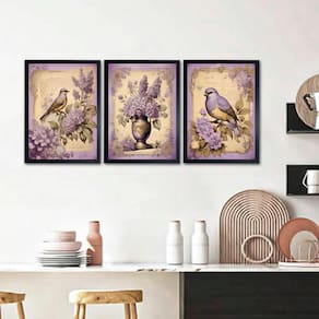 Kit 3 quadros vintage passarinhos e flores lilás 45x34cm Moldura: madeira preta Informações do produto tire todas as suas dúvidas no descritivo abaixo: decoração para quarto, sala, cozinha, escritório, área gourmet e muito mais. Chega de paredes vazias. Medidas - cada peça tem 45x34cm a3 . Material do papel - papel fotográfico brilhante de altíssima resolução acabamento - todos os quadros são acompanhados de uma película de acetato para proteção da imagem. - os quadros são embalados de forma segura com plástico bolha com camada dupla de acordo com o tamanho dos quadros. Garantia - garantia de 3 meses. Meu quadro chegou. Como posso fixá-lo Você precisa apenas de um martelo e um prego, pois os quadros já vão acompanhados de penduradores. Esta é a forma mais indicada. Caso prefira, você pode utilizar uma fita dupla face neste caso, sugerimos de alta qualidade para evitar que descole e seu quadro caia . Como posso limpar meu quadro A limpeza é feita como um móvel comum da sua casa. Apenas um pano seco ou espanador são suficientes para tal Ean: 7899176428083