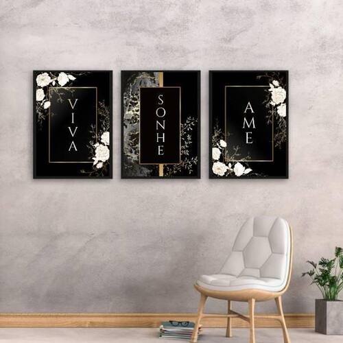 Kit 3 quadros viva, sonhe, ame - preto 33x24cm - com vidro Moldura: madeira preta Informações do produto Decoração para quarto, sala, cozinha, escritório, área gourmet e muito mais. Chega de paredes vazias medidas - cada peça tem 33x24cm a4 . Material do papel - papel fotográfico brilhante de altíssima resolução Acabamento - todos os quadros são acompanhados de vidro para proteção da imagem. - Moldura em madeira maciça na cor preta e pendurador . - Os quadros são embalados de forma segura com plástico bolha com camada dupla de acordo com o tamanho dos quadros. - de 3 meses. Meu quadro chegou. Como posso fixá-lo Você precisa apenas de um martelo e um prego, pois os quadros já vão acompanhados de penduradores. Esta é a forma mais indicada. Como posso limpar meu quadro A limpeza é feita como um móvel comum da sua casa. Apenas um pano seco ou espanador são suficientes para tal Marca: Não Informado